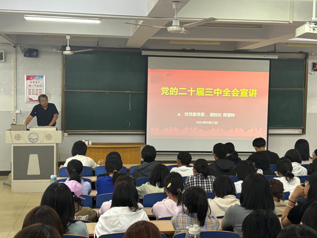 9月25日下午,公司党委常委、副董事长蒋爱林面向文法公司师生在开发区综合楼412教室集中宣讲党的二十届三中全会精神,9428cn太阳集团古天乐师生代表百余人听取了讲座报告。