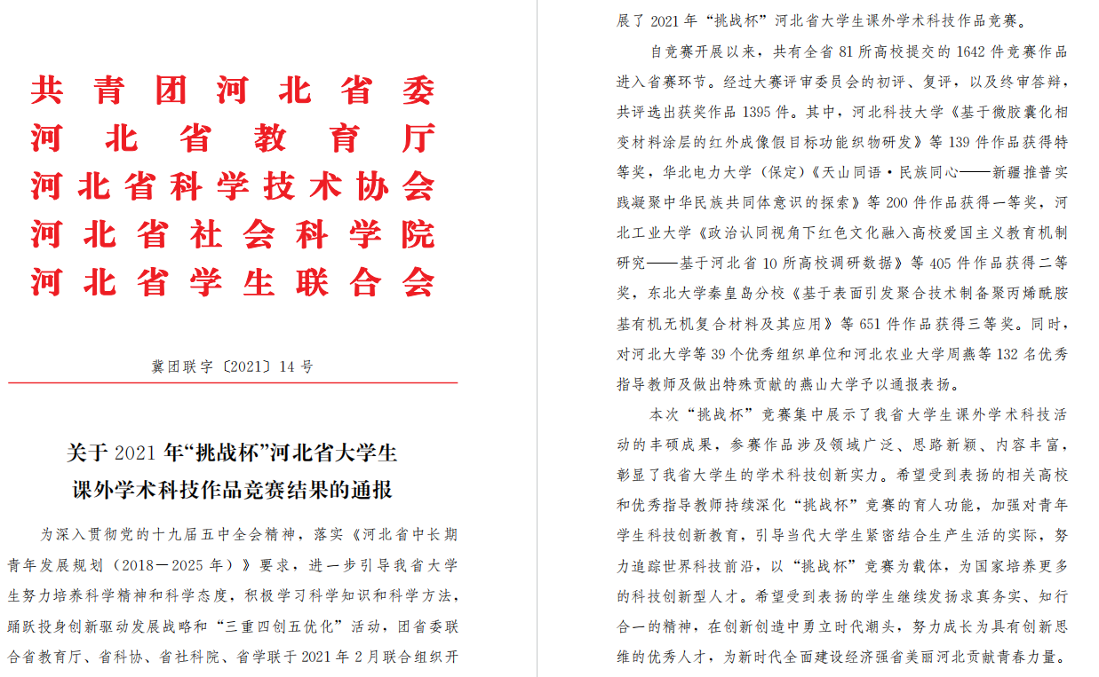 关于2021年度挑战杯河北省老员工课外科技作品竞赛