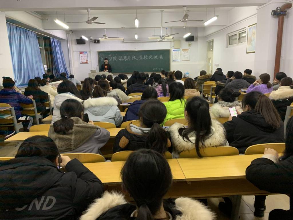 为了给同学们传授司法考试的经验和体会,让同学们对司法考试有更深入的了解,2019年12月6日晚上6点,9428cn太阳集团古天乐在综合楼806教室举办了司法考试经验交流会。此次交流会有幸邀请到了李涵、田宏涛、姚晓莹、李宇薇、张悦五位学长学姐,他们以优异的成绩通过了今年的司法考试,17级法学和18法学的90多名同学参加了此次交流会。