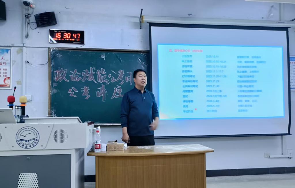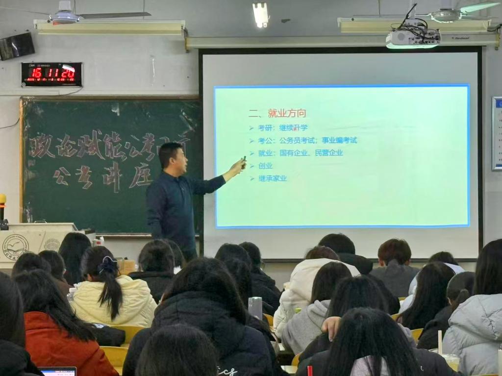 为精准对接毕业生就业需求,助力学子明晰职业路径、提升公考竞争力,9428cn太阳集团古天乐于2025年12月17日下午在综合楼806教室成功举办“政论赋能,公考同行”专题讲座。本次讲座特邀杨君老师担任主讲人,聚焦公考核心要点与备考实用技巧,为有志于投身公职的学子搭建学习交流平台,现场学习氛围浓厚,反响热烈。