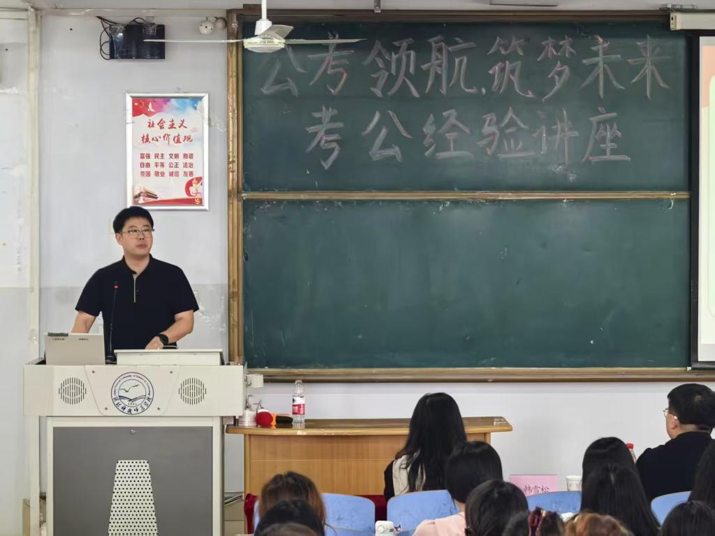 讲座伊始,韩雪松主任以亲切幽默的语言迅速拉近与同学们的距离,结合自身多年工作经验及案例,围绕公务员与事业编概述、考试时间与报名、选调生介绍、考试内容、备考策略这五大核心板块展开分享。在经验分享环节,韩主任倾囊相授个人总结的“黄金备考法则”。通过行测、申论等方面的具体复习方法详细展开,向同学们传授自身的宝贵经验,并与同学们热情互动,为同学们破解公考相关的疑惑。
