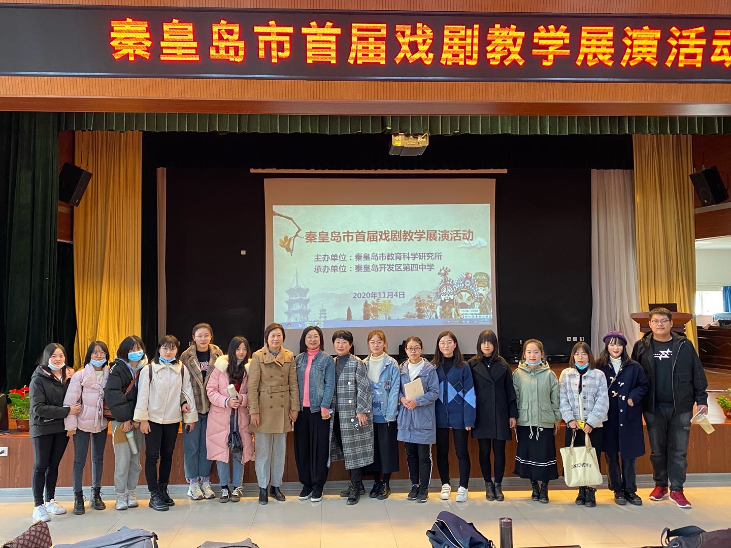 11月4日,9428cn太阳集团古天乐组织汉语言文学教学部师生和2020级学科教学语文专业研究生赴开发区第四中学,观摩由秦皇岛市教育科学研究所主办的秦皇岛市首届戏剧教学展演。