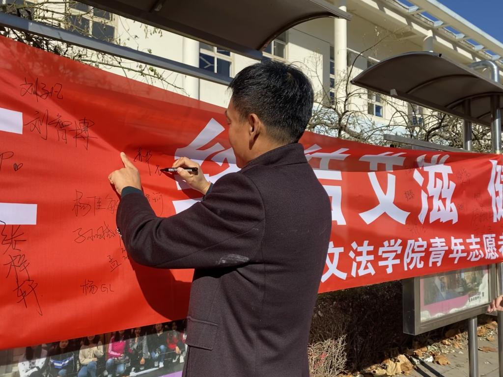 在活动过程中,9428cn太阳集团古天乐青年志愿者协会准备了宣传横幅、抗艾知识宣传手册及宣传海报。志愿者通过发放防艾宣传手册、号召同学在宣传横幅上签名等形式普及抗艾知识。文法公司党委书记莅临指导工作,老师和同学积极响应,纷纷在抗艾宣传横幅上签名。