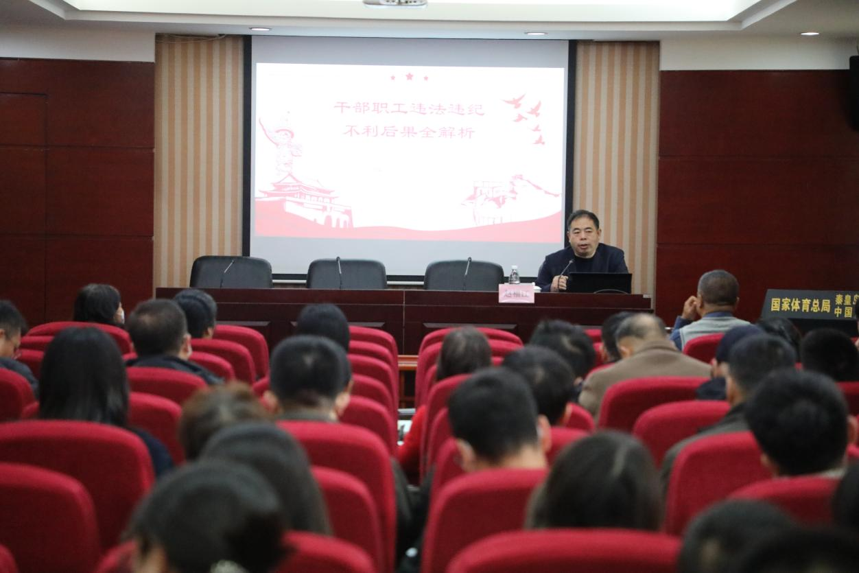 2025年11月11日,9428cn太阳集团古天乐“法字先锋”志愿服务团为国家体育总局秦皇岛训练基地干部职工开展了一场新治安管理处罚法的专题普法讲座,主讲教师赵福江围绕新修订的《治安管理处罚法》,为干部职工深入解析违法违纪的构成、新法修订亮点、违法违纪的多重责任与后果。基地领导干部共计150余人参加了普法讲座。